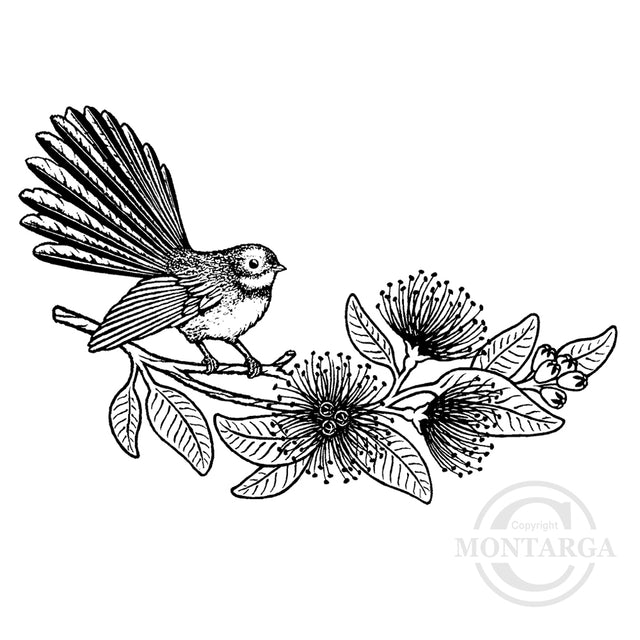 1400 GG Fantail Pīwakawaka on Pōhutukawa Branch Rubber Stamp
