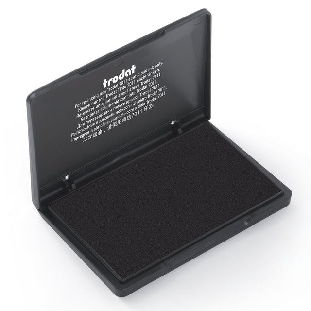 Pre inked pad with easy to use flip lid and sturdy plastic outer casing.